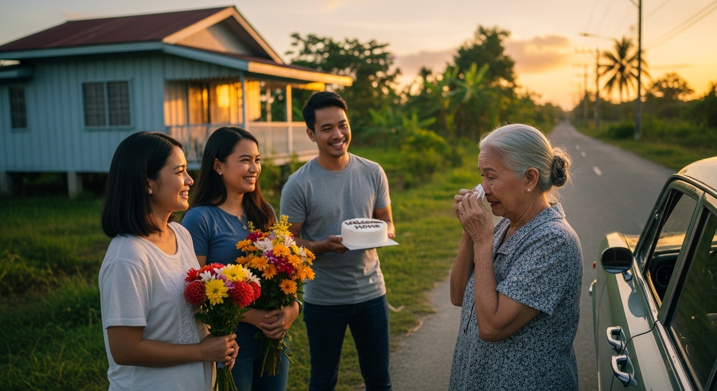 Sa bakuran, nakatayo ang dalawang anak pa niyang sina Jonas at Mila, may dalang cake at bulaklak.