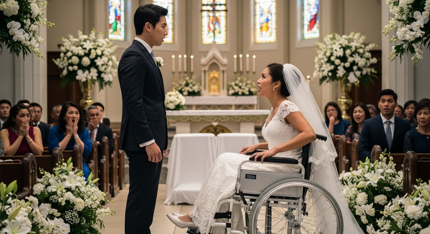 Ngunit sa ilalim ng belo, nakaupo siya sa wheelchair, nakatingin sa altar na walang groom.
