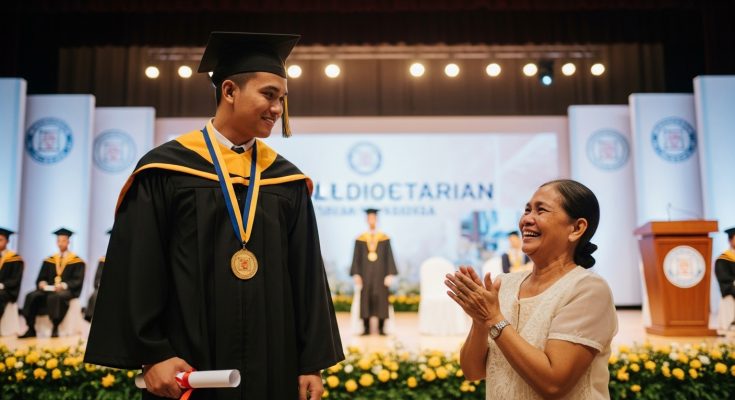 Sa entablado ng eskwela, nakaupo si Carlo sa harapan — suot ang toga, at may karatulang “VALEDICTORIAN.”