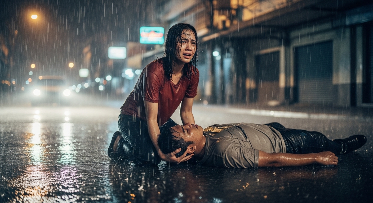 Sa gitna ng kalsada, sa ilalim ng malakas na ulan, may lalaking nakahandusay, basa, duguan ang noo, at walang malay.
